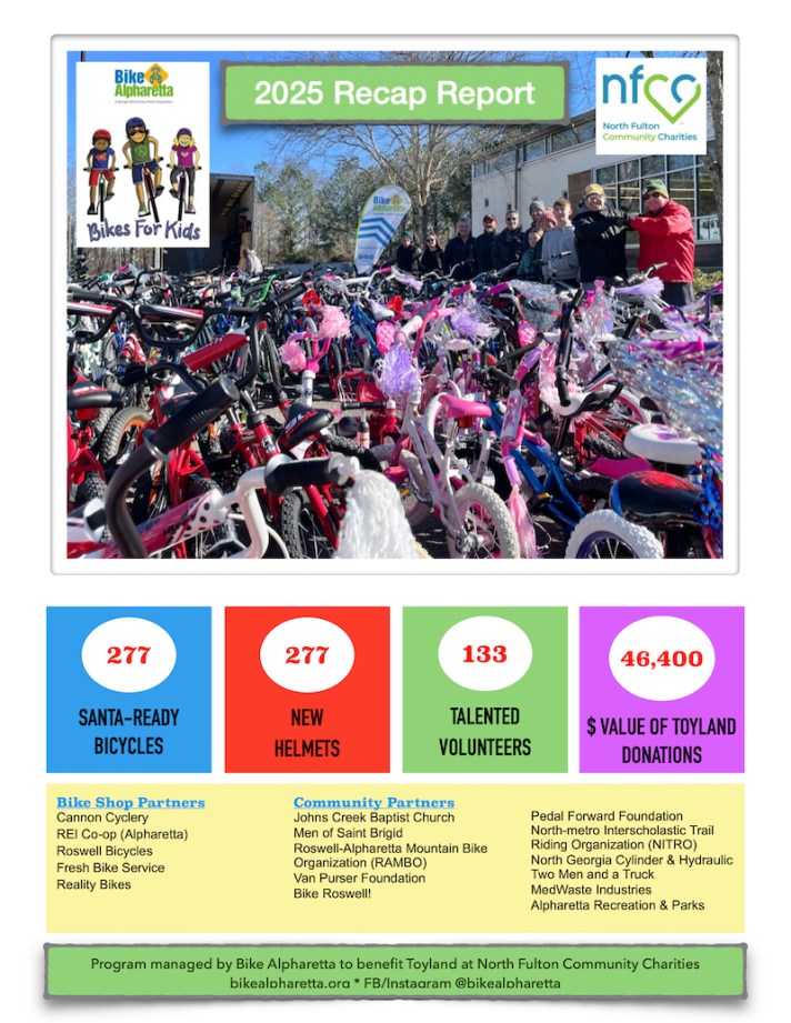 The annual Bikes For Kids community program concluded December 13, 2025 to support the Toyland at North Fulton Community Charities (NFCC). Bike Alpharetta, along with more than 133 volunteers and 12 community partners collected, repaired and prepped hundreds new and previously-loved bikes and scooters in ONE DAY, with 277 going to NFCC’s Toyland for families in need during the holidays. A total of 277 new helmets were provided as well. More than 20 used bikes and new helmets were also provided to the Pedal Forward non-profit.