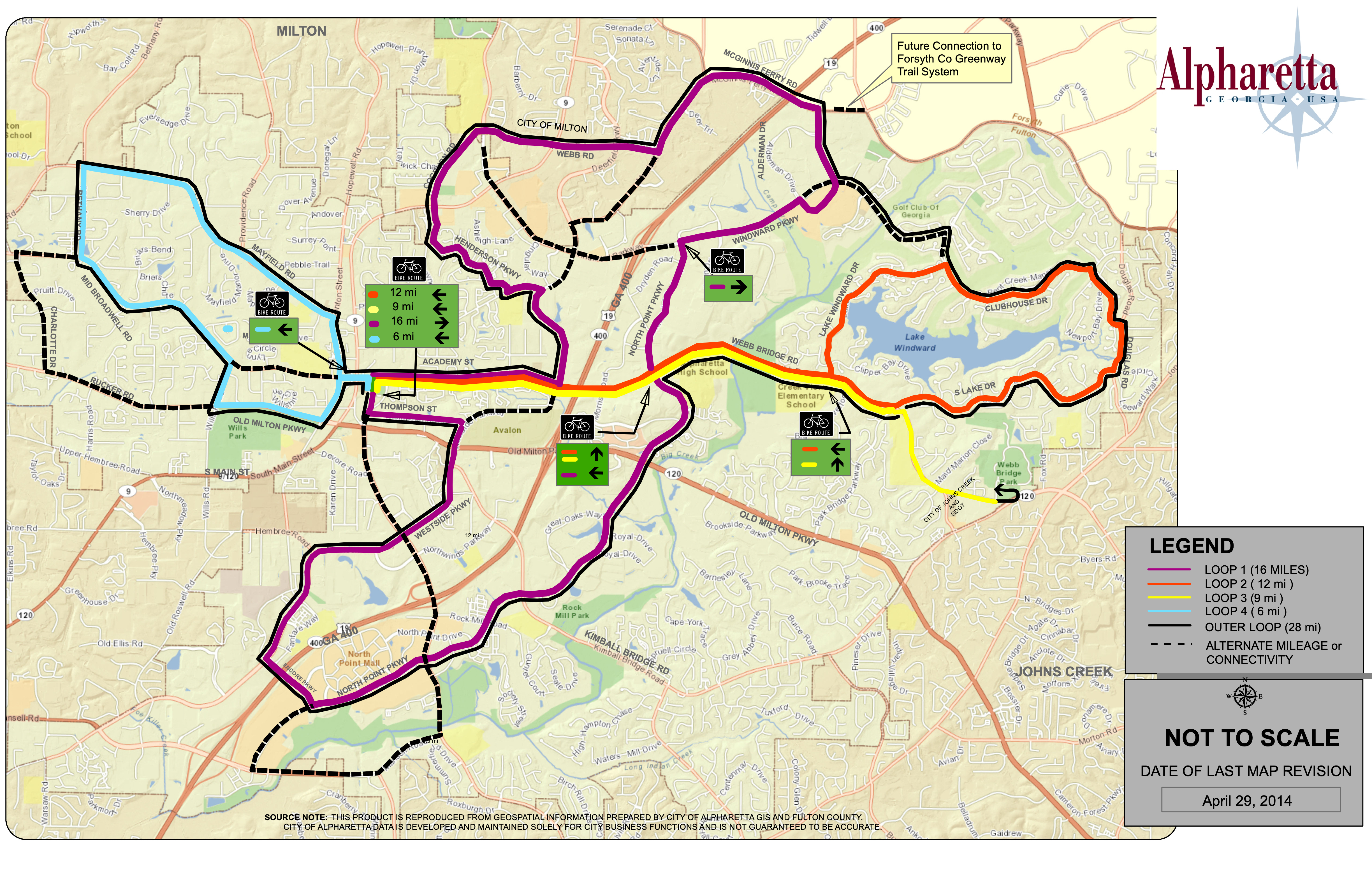 The City of Alpharetta, with input from non-profit organization Bike Alpharetta Inc., has adopted four City Bike Routes and a City Bike Routes Map. These routes are recommended for easy connectivity to parks, schools and shopping, as well as beautiful roadways with wide shoulders or bike lanes for safer travel. These routes are marked on Share the Road signs with a designated route color and the number of miles to/from the new City Center, ranging from six to 16 miles. The Orange Route (12 miles) and Yellow Route (9 miles) provide connections to the Big Creek Greenway.